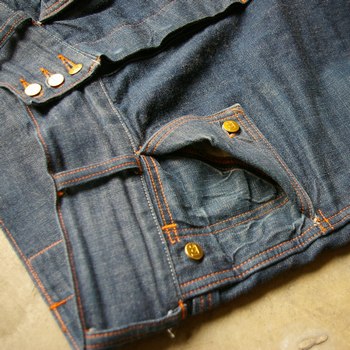 当時物に見られた二本針巻縫い仕様やハンドメイドによる両玉縁ポケット・ジッパーフライ等を取り入れて製作する事によってその雰囲気が強調されます。