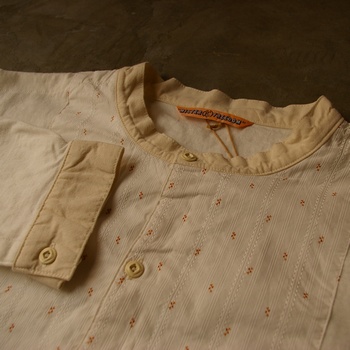 また、襟元、袖口に関しては、ベージュ色のシャンブレー生地を使用し、強度、雰囲気を加えた仕様になっています。
