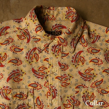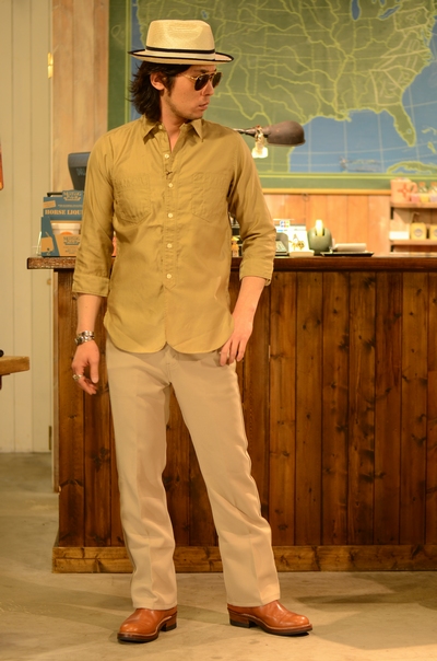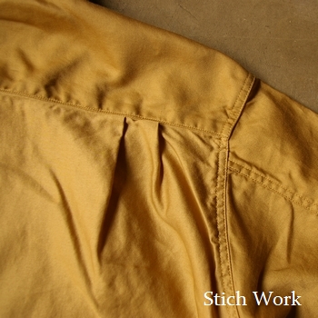 当時のメインとなったワークシャツは、アンティークなシャツの形状に多い、前身頃部分が大きくラウンドしていて、裾の身頃が重なるような仕様になっているが、今回ののシャツは、40年代頃のワークシャツに多い、フロントの前身頃にそって、真っ直ぐでシルエットの綺麗なラインの裾をデザインとして採用しました。