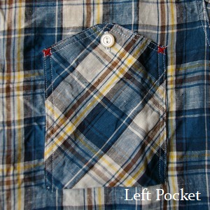右胸同様の釦留めとなり、ポケット入口部分に施されるかんどめは異色のステッチによって留められワンポイントとなっている。