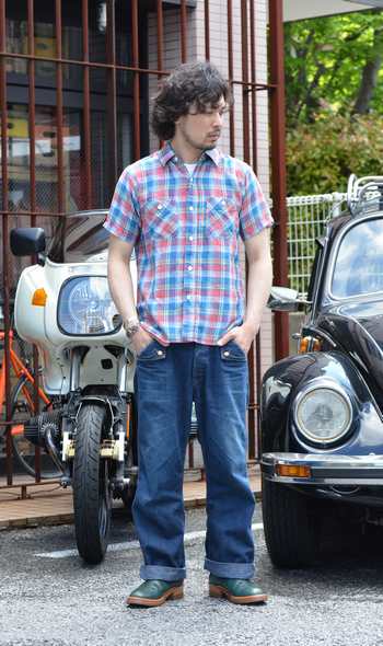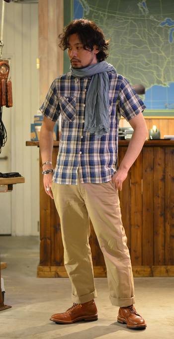 No.002と同じパンツを合わせながらシャツとブーツを変えるだけで全く違ったイメージとなります。