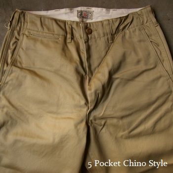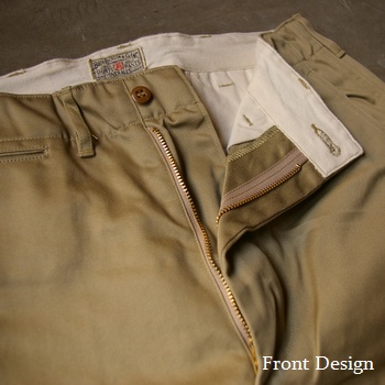 オーソドックスな5ポケットのチノスタイルデザインながら、各部にBuzz Rickson'sらしい拘りが見られる一本。