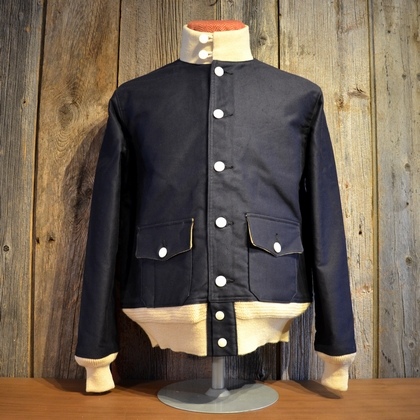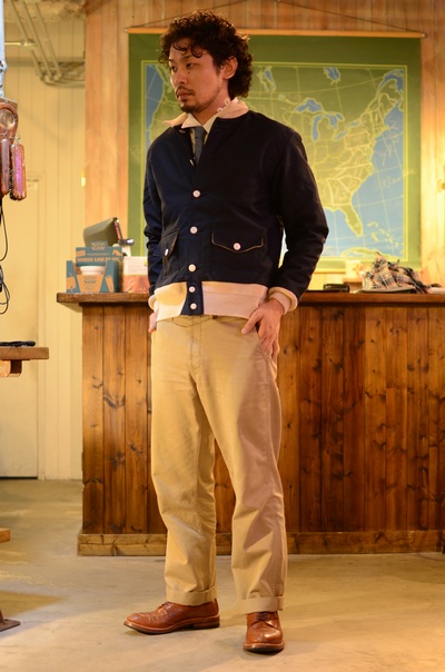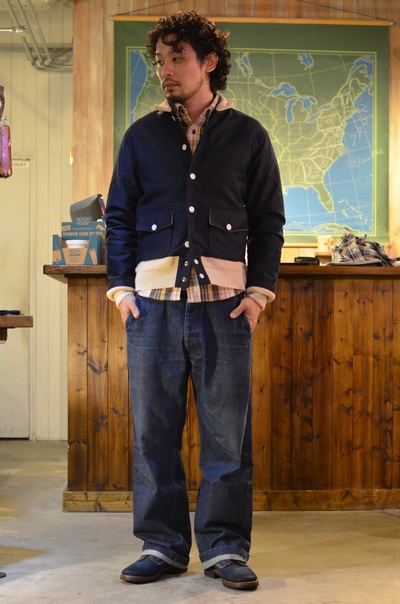 メインマテリアルのジャングルクロスをネイビー色に、リヴとボタン(60年代のNOS)はホワイトを使い、海軍ユニフォームのメインカラーで構成している、洒落た一着。