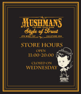 2013年9月より、MUSHMANS店舗の定休日が【毎週水曜日】となりました。