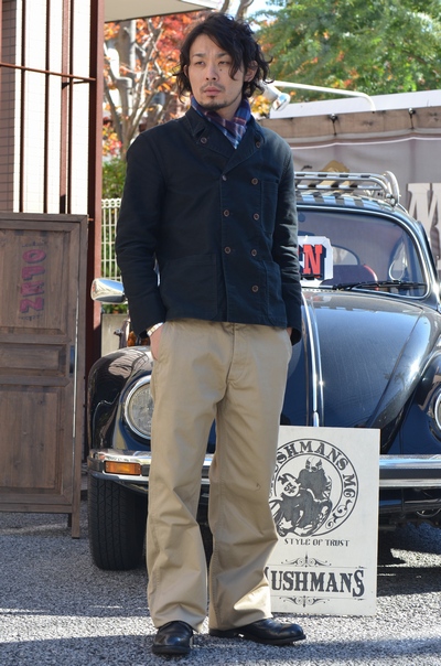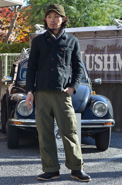 調整したとは言え、ジャケットスタイルながら非常に短めの着丈が、こういった武骨なパンツとのコーディネートに活躍してくれます。