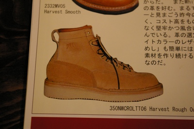 本来White'sのようなリアルワークブーツメーカーはHARVESTのような風合いを持つ革材料を使用する事はありません。何故かというと、HARVESTのように非常に繊細な特徴を持つ革材料はブーツ自体の製造が非常に難しくなるからであります。