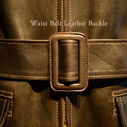 ウエストベルトのバックルには、タンクやその他への攻撃性を考慮して同素材(レザー)を巻いた仕様となっている。