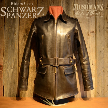 サイズ38の着丈寸法が77.0cmという、ライダースコートタイプでは比較的長めの設定は、フロントジッパーの装着位置との関係で違和感無く着用いただける設定である。