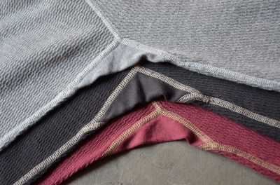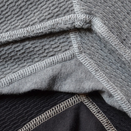 サーマルのゴム編みのような構造は伸縮性と復元性に富み、ストレスの無いフィット感と「洗濯すると元に戻る」耐久性が特徴です。