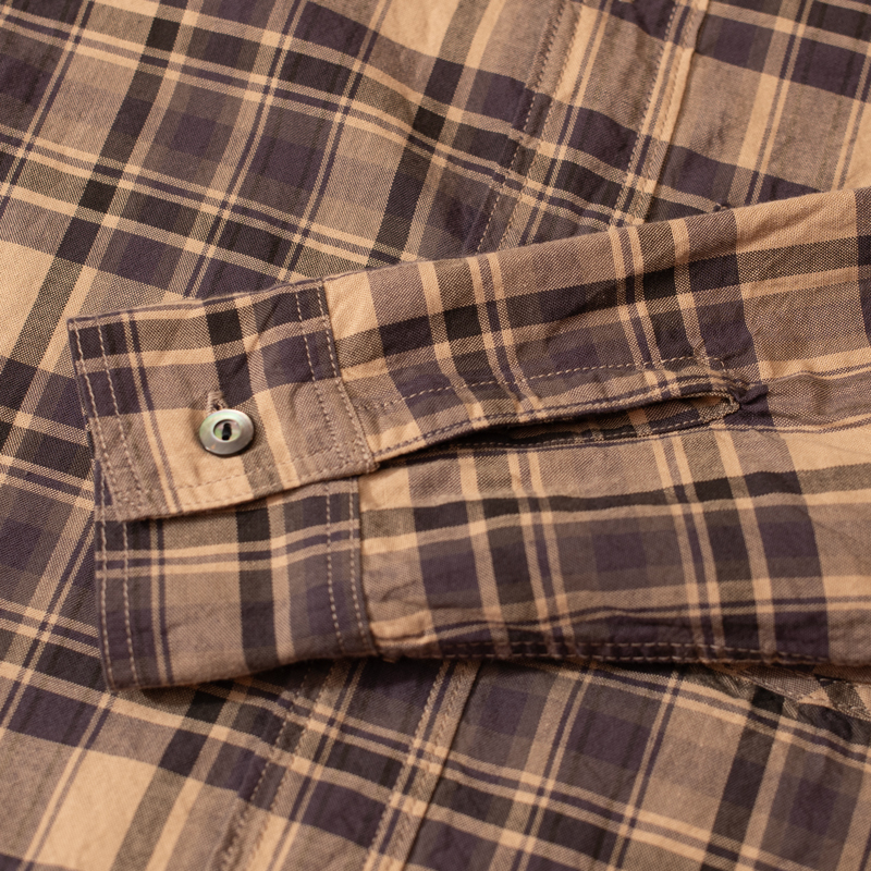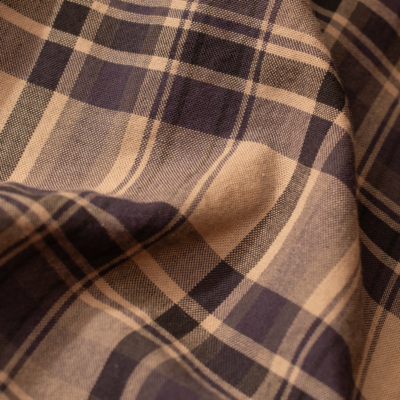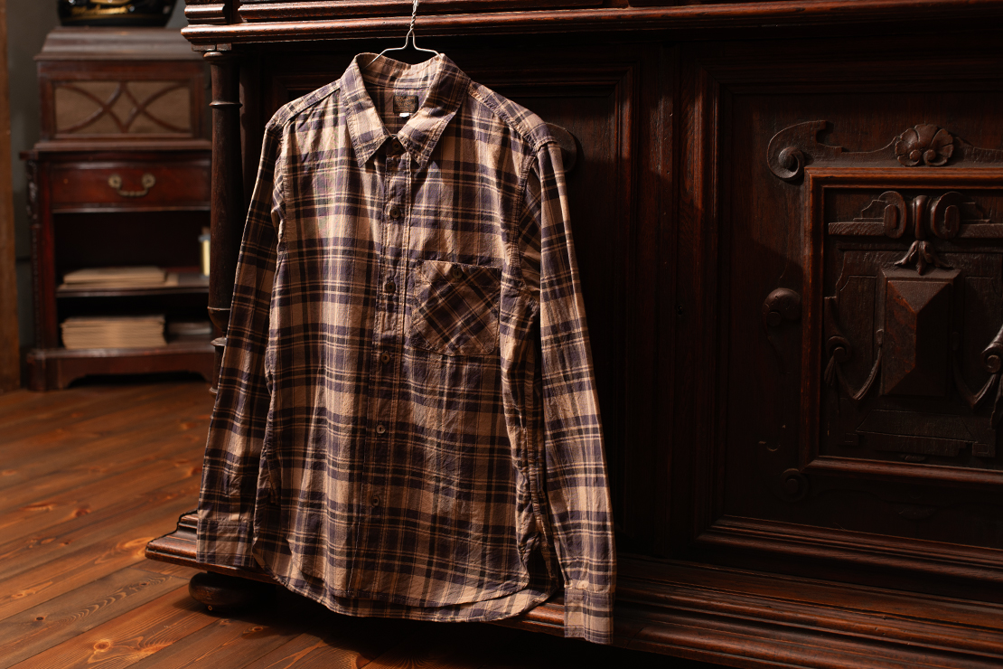 縫製にはユニオンスペシャルを用い、強度と表情の両立を意識した仕立て。均一すぎないステッチは、量産品にはない温度を感じさせ、着込むほどに生地とともに馴染んでいきます。チェック柄という定番の中に、確かな作りの差が静かに表れています。
