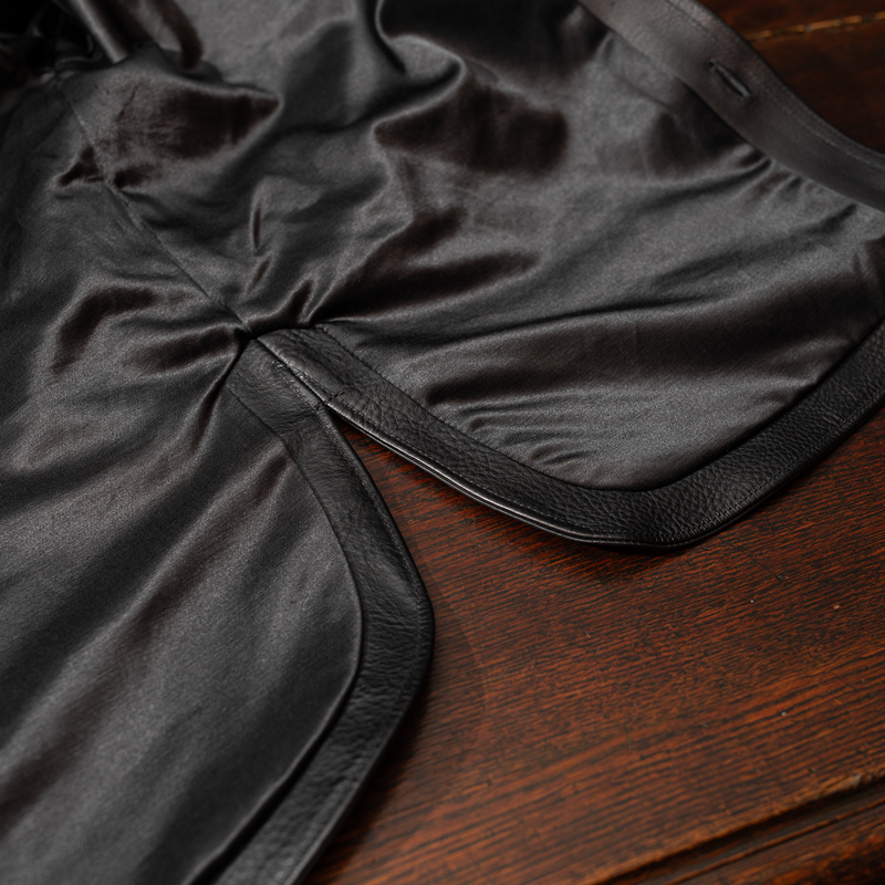 レザーシャツというと、裏地を付けない仕様のものも多いのですが、今作では着用時の滑りや快適性を考え、裏地を全面に配置しました。