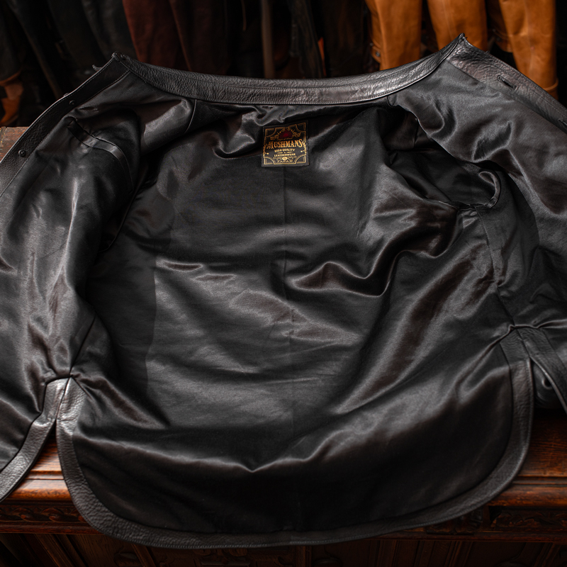 画像をご覧いただきますと分かります通り、前身頃に接ぎはなく、後ろ身頃は申し訳程度にヨークがあるものの、ほぼ一枚革仕様という事になります。