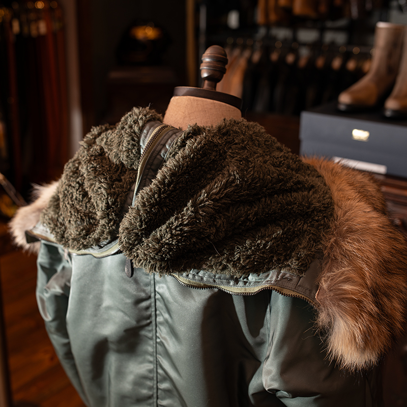 フードに取り付けられるファーは、リアルコヨーテファーを使用しており、着用時の肌触りの良さと保温性は本毛皮ならでは。高級感もありますね。