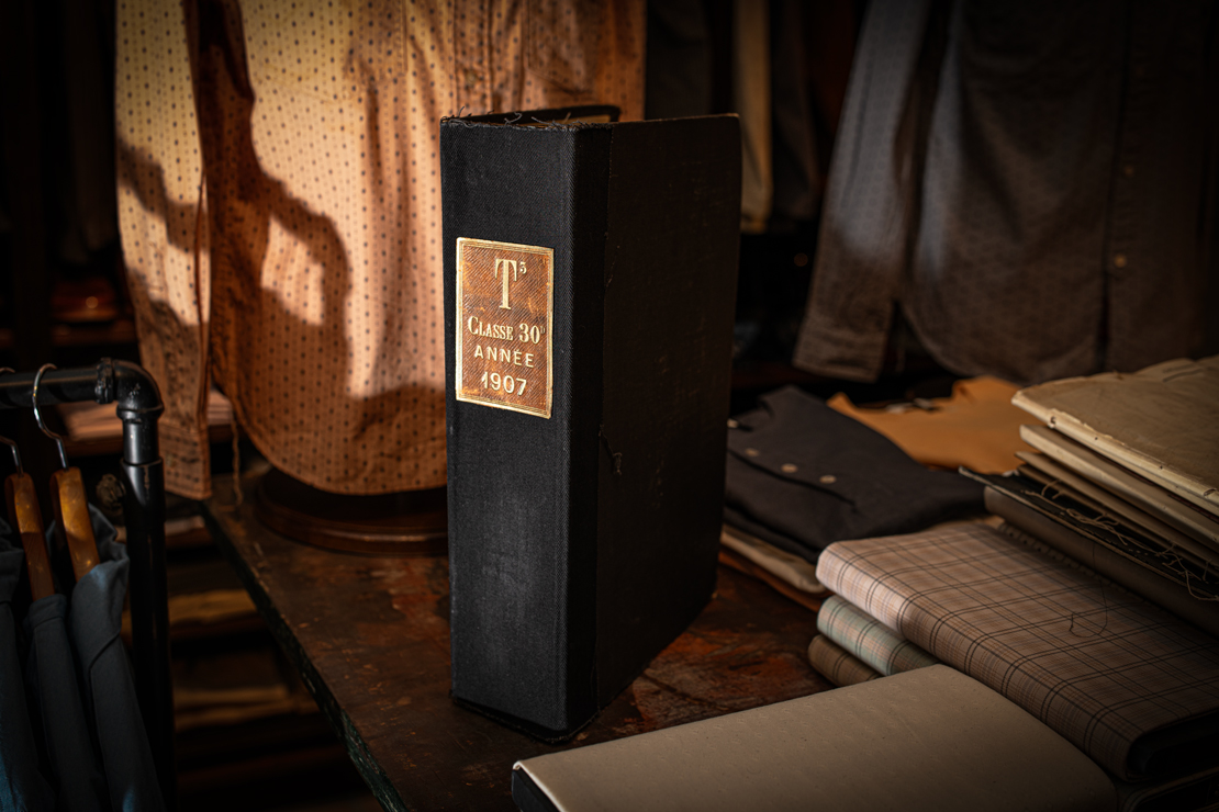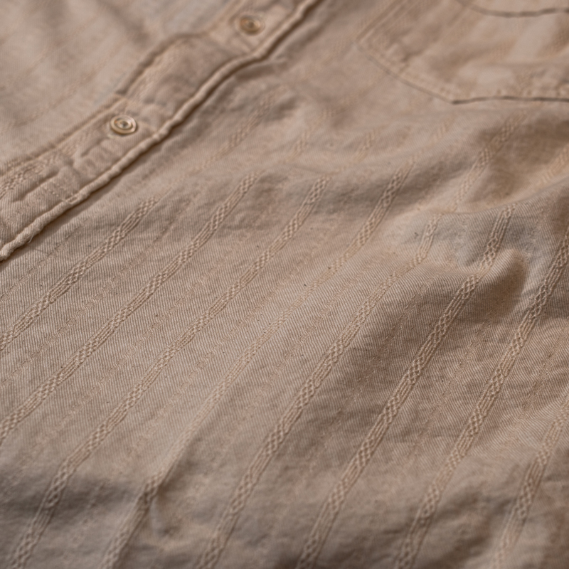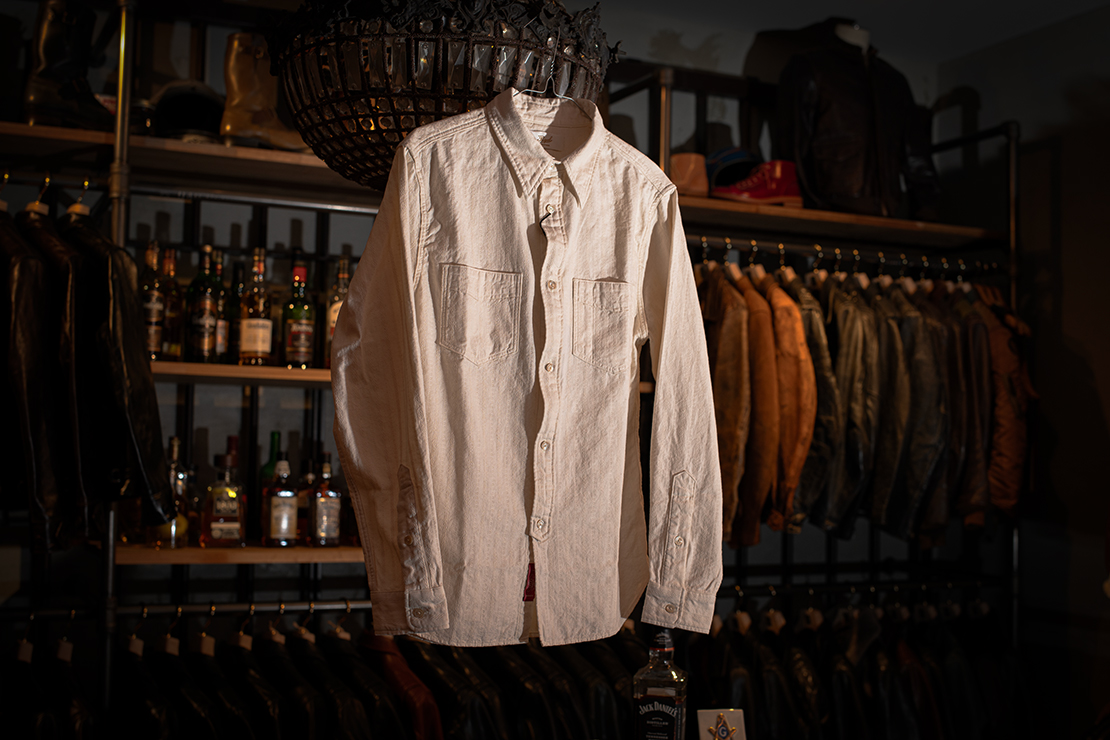 シャツ型は、1930年代のフランス古着から着想し、ロングポイントカラー(襟)のスタンダードなディテールを採用しております。