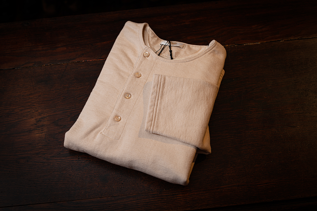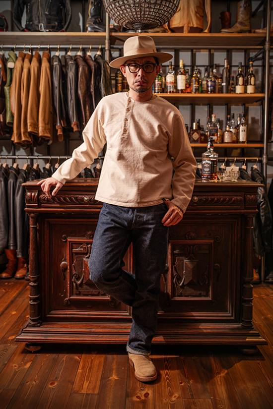 先にご紹介したヘンリーネック仕様を排し、よりシンプルに仕上げたモデルです。